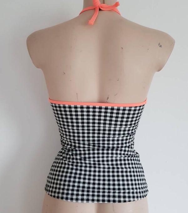 Zwart-wit geblokte tankini top met oranje bies en oranje knoopsluiting in de nek.