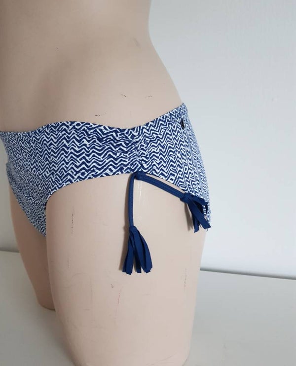 Blauw-wit gewerkt bikinibroekje met BLAUWE kwastjes aan de linkerkant.