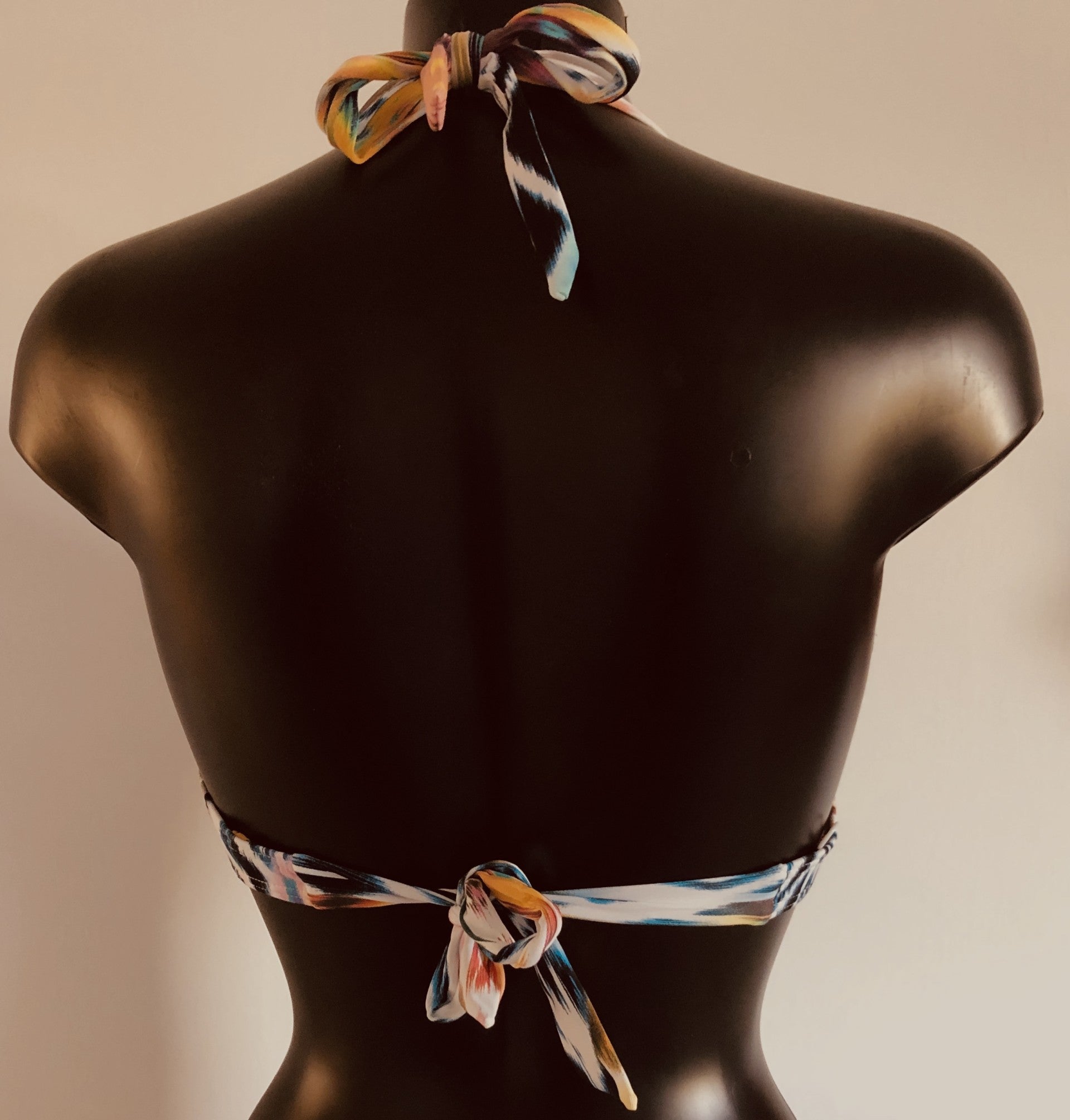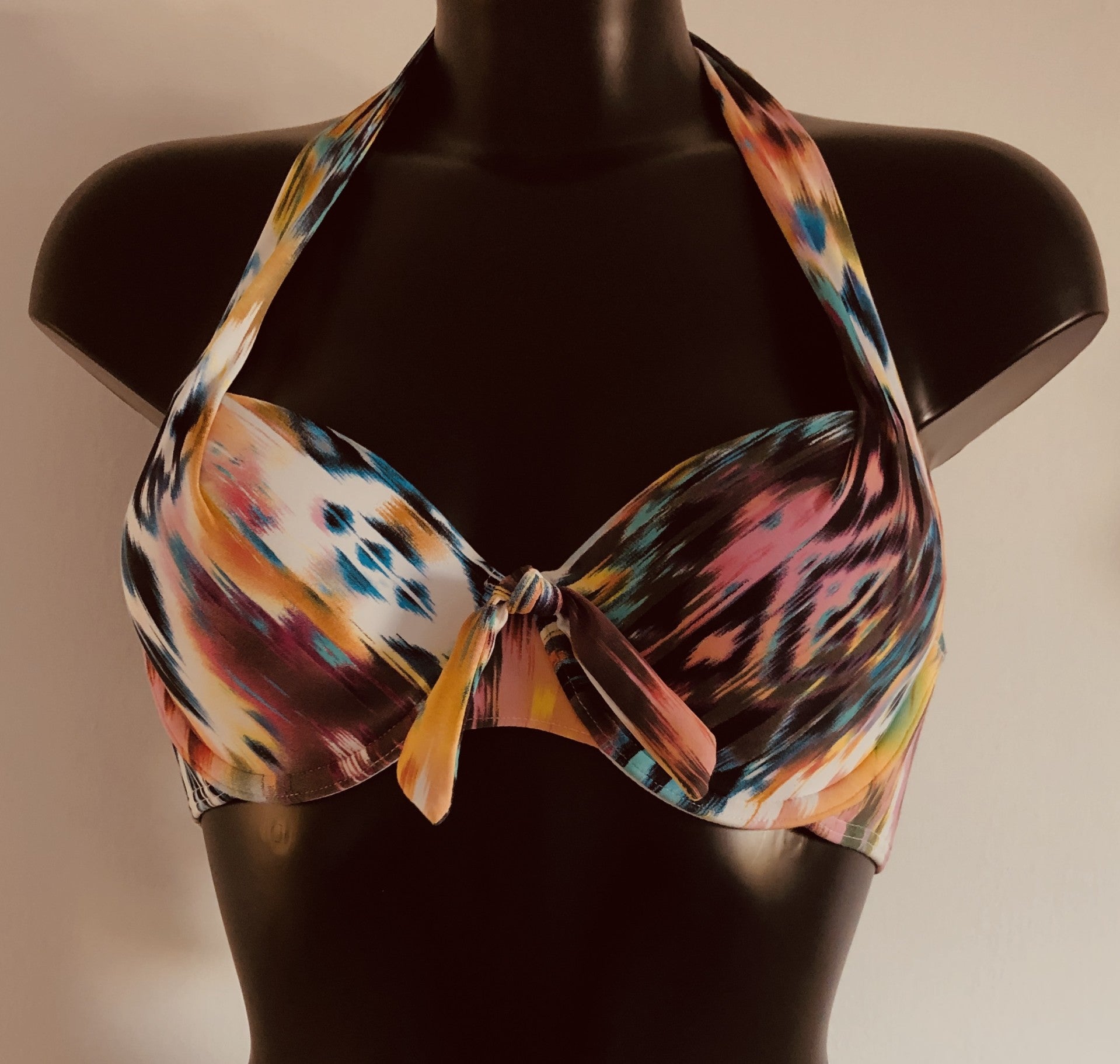 Mooie bikini top, voorgevormde cups met beugel, knoopsluiting in de nek en op de rug, dus flexibele pasvorm.