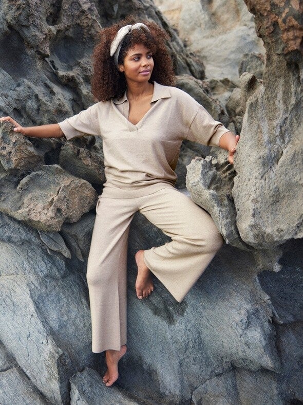 Prachtige zandkleurige trui van Livera. Korte mouwtjes en een boordje langs de mouwen en onderkant.