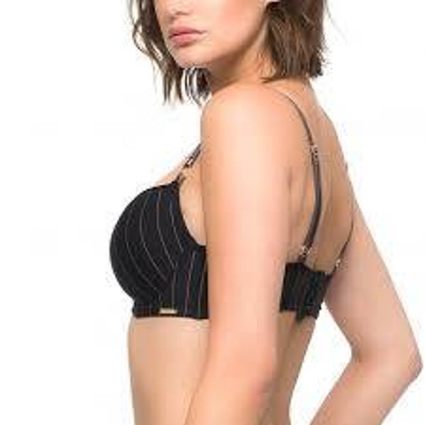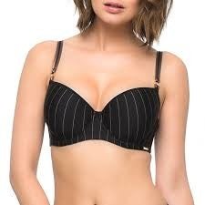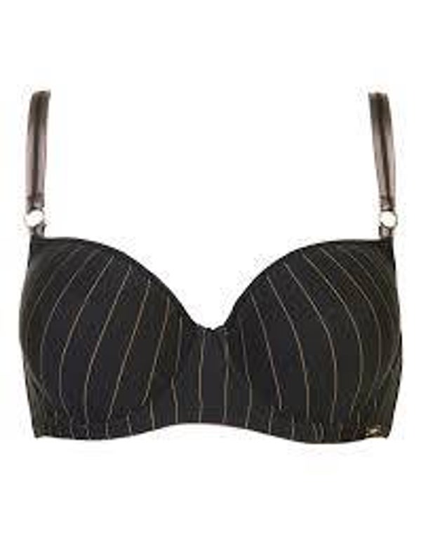 Stevige voorgevormde BH met beugel. Heel goed voorde grote cup. Zwarte BH, met taupe kleurige strepen en schouderbanden.